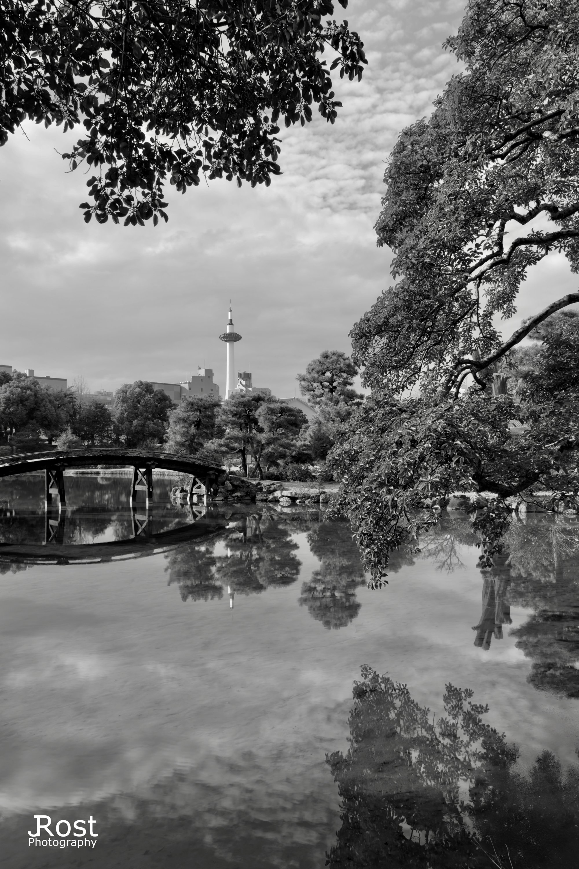 A serene view from Shoseien towards Kyoto Tower in Kyoto, Japan.
